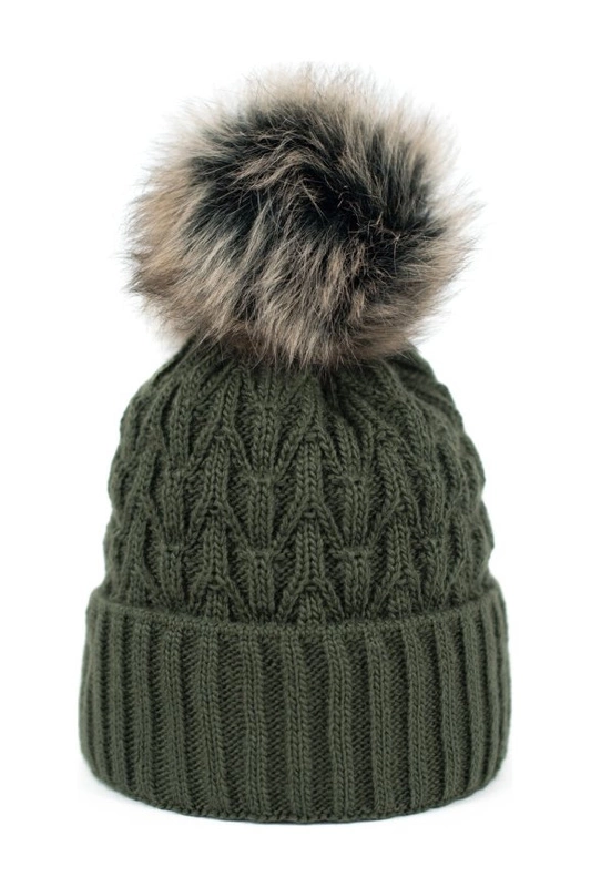 Cieplutka czapka zimowa zdobiona futrzastym pomponem.