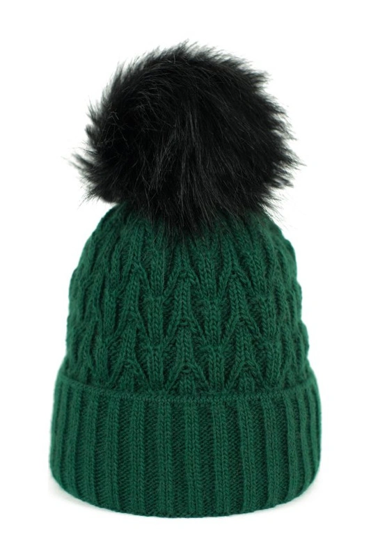 Cieplutka czapka zimowa zdobiona futrzastym pomponem.