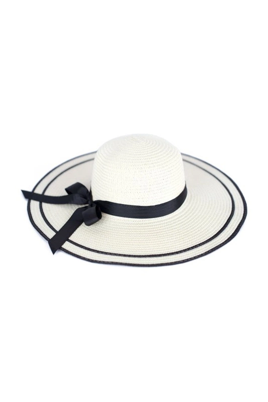 Letni plażowy kapelusz damski, w którym zwraca uwagę szerokie rondo z paskami i fantazyjna wstążka.