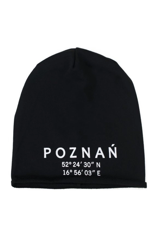 Czapka z nadrukiem nazw największych polskich miast wraz z współrzędnymi,