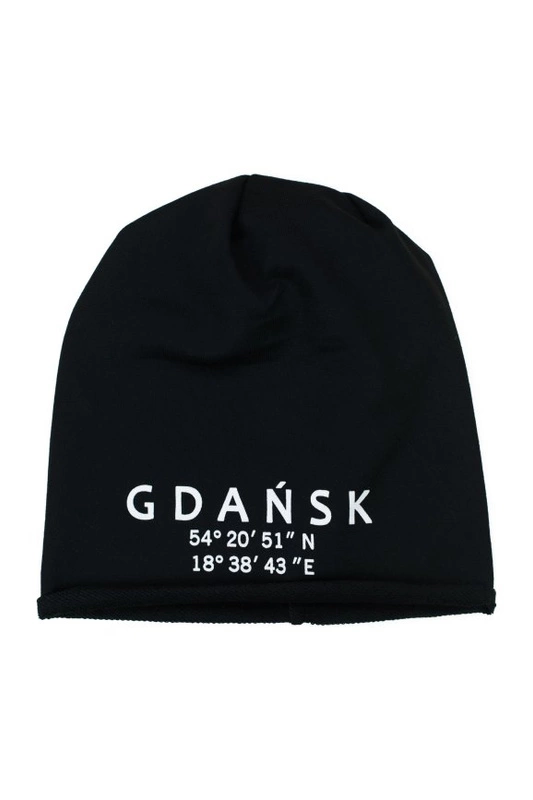 Czapka z nadrukiem nazw największych polskich miast wraz z współrzędnymi,