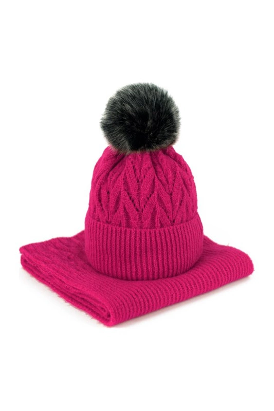 Czapkę zdobi duży pompon ze sztucznego futerka i klasyczny zimowy wzór.