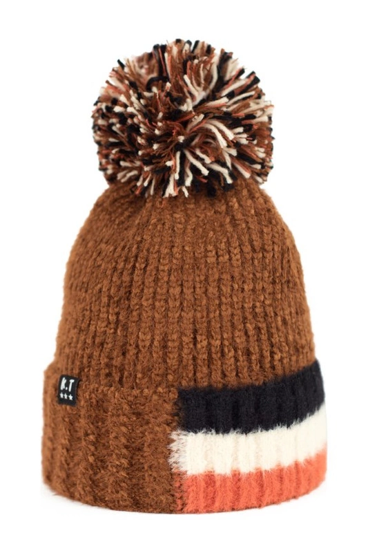 Wywijana czapka z pomponem wykonana z milutkiego w dotyku materiału.
