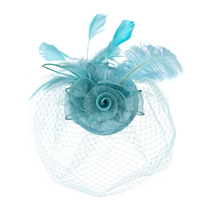 Model został ozdobiony fantazyjnie uformowanym kwiatem, lekkimi piórami oraz subtelną woalką, tworząc wyrazistą, dekoracyjną całość.