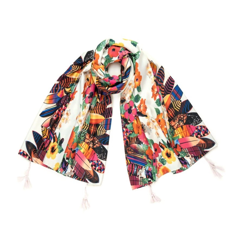 Zakończony frędzelkami. Miękki i przyjemny w dotyku.