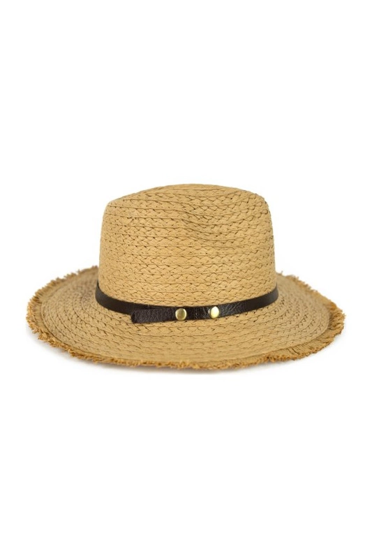 Letni kapelusz typu fedora z rondem zdobionym tasiemką z eko skóry.