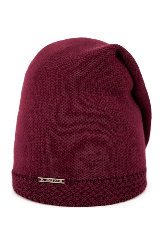 Czapka przejściowa o dłuższym kroju, zakończona ozdobnym ściegiem.