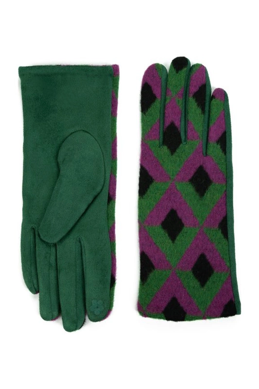 Eleganckie, kolorowe rękawiczki z geometrycznym wzorem.