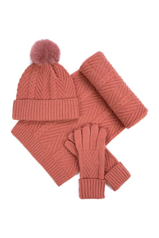 Zimowy komplet o ciekawym splocie, w którego skład wchodzi czapka, rękawiczki i szal.