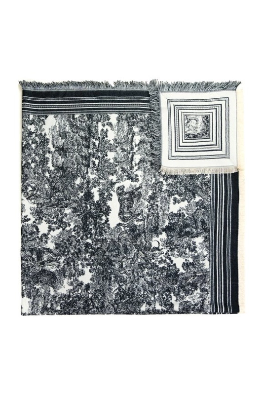 Chusta o abstrakcyjnych wzorach zakończona delikatnymi frędzelkami.