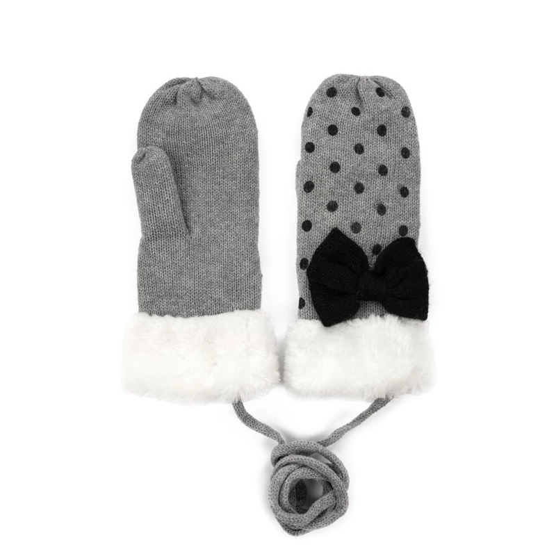 Młodzieżowe rękawiczki jednopalczaste w kropki, ozdobione kokardką.