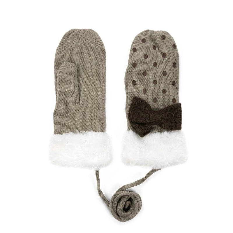 Młodzieżowe rękawiczki jednopalczaste w kropki, ozdobione kokardką.