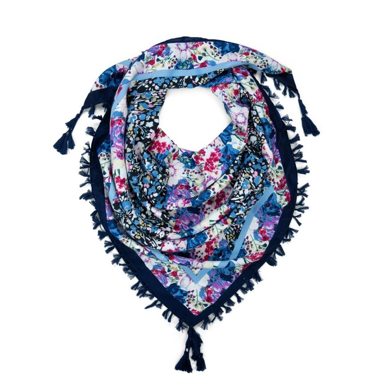 Kolorowa wiosenna chusta w kwiatki, zakończona małymi frędzelkami.