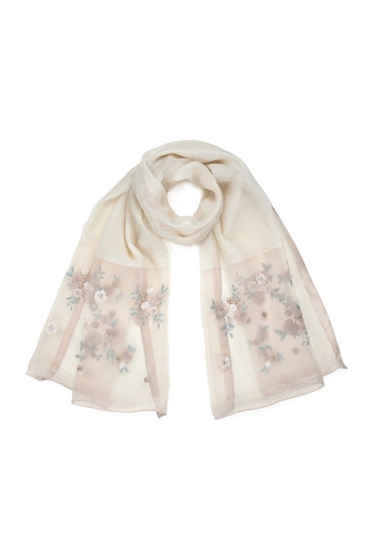 Materiał posiada błyszczące wykończenie i ozdobne, haftowane kwiatki.