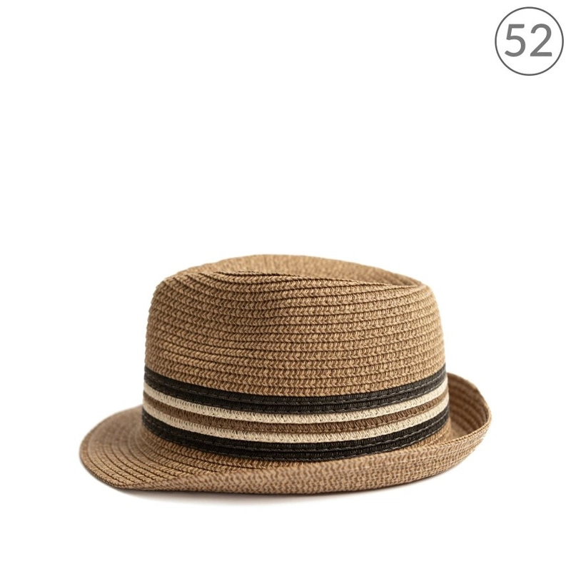 Kapelusz słomkowy dla dzieci typu trilby z ozdobnymi trwałymi paskami.