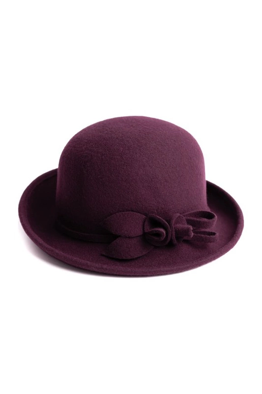 Elegancki, jesienny kapelusz z asymetrycznym rondem i ozdobną aplikacją.