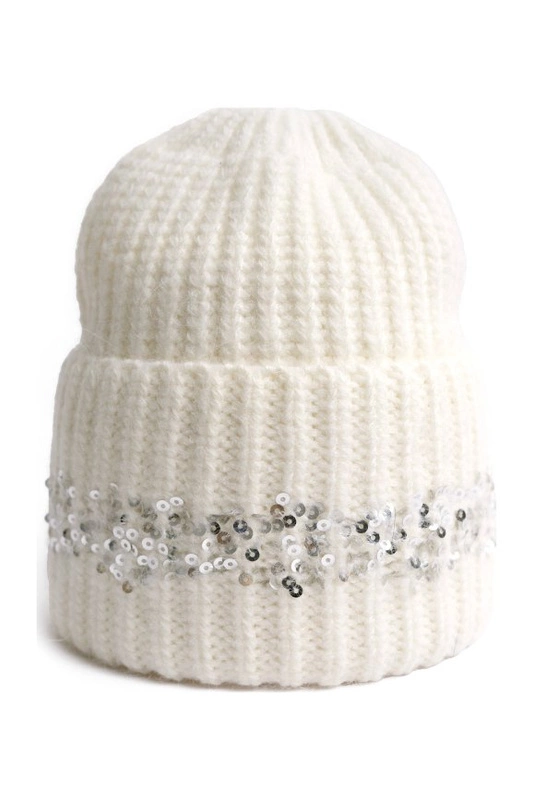 Ozdobna aplikacja z cekinów dodaje subtelnego blasku, nadając czapce elegancki, kobiecy charakter.