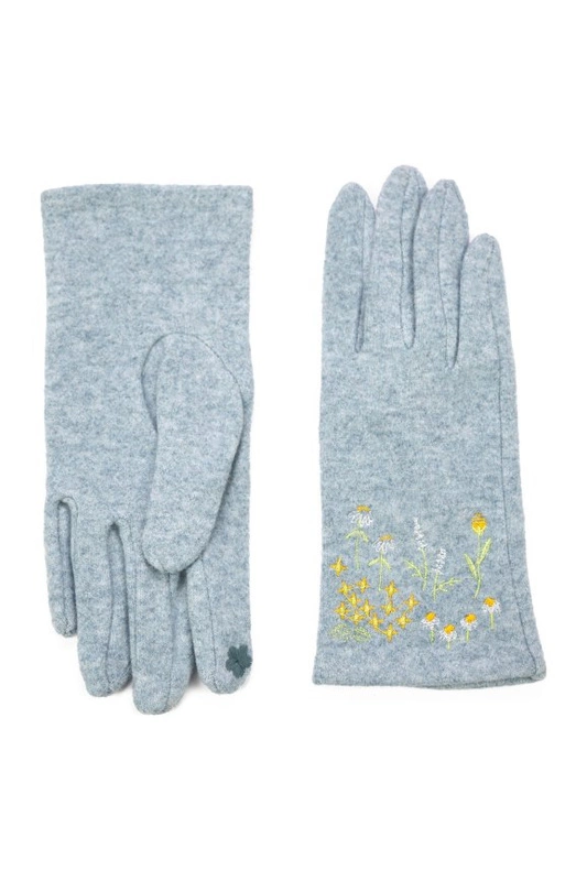 Damskie rękawiczki z łączonych materiałów z ozdobnym kwiatowym haftem.