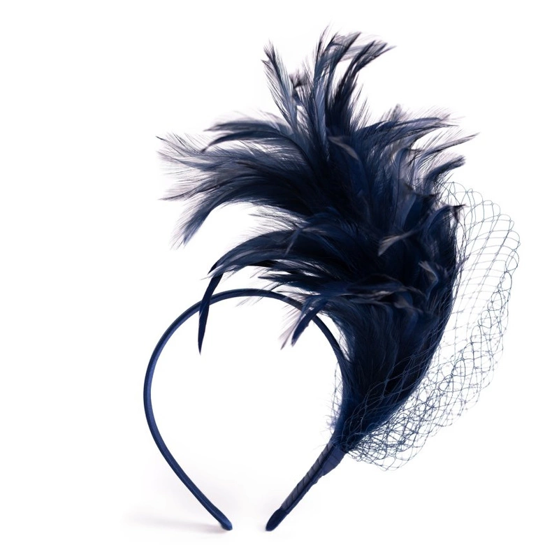 Model wyróżnia się bogatymi, dekoracyjnymi piórami z woalką, które tworzą wyrazistą kompozycję idealną na wesela, przyjęcia oraz formalne wydarzenia.