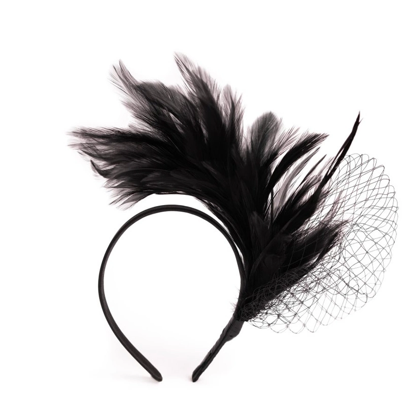 Model wyróżnia się bogatymi, dekoracyjnymi piórami z woalką, które tworzą wyrazistą kompozycję idealną na wesela, przyjęcia oraz formalne wydarzenia.