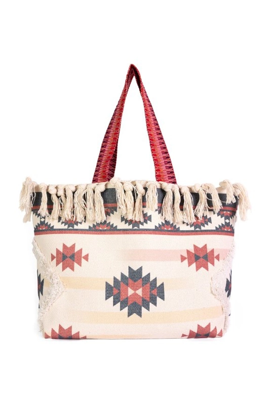Duża, materiałowa torba typu worek w azteckie wzory, wykończona frędzelkami.