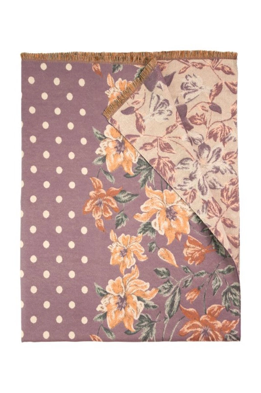 Wyjatkowy, ciepły damski szal ozdobiony motywem kwiatowym i subtelnymi groszkami.