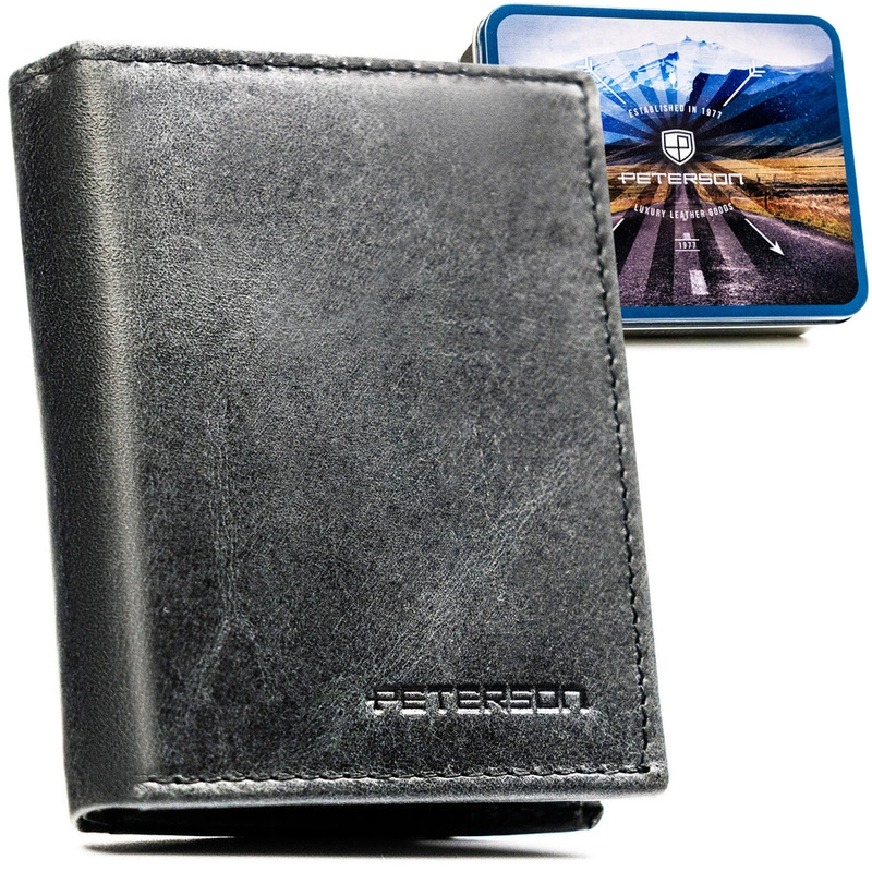 Pionowy, czarny portfel męski ze skóry naturalnej wyposażony w system RFID - Peterson