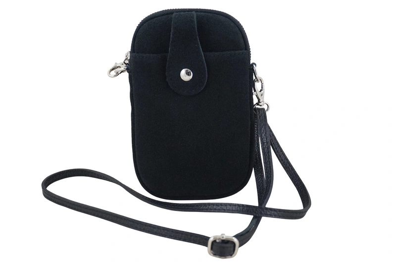 Etui na telefon ze skóry zamszowej w kolorze czarnym - stylowe i funkcjonalne rozwiązanie dla osób, które cenią wygodę, minimalizm i elegancki design. Wykonane z wysokiej jakości skóry zamszowej, doskonale sprawdzi się zarówno na co dzień, jak i podczas wyjść, kiedy chcesz mieć przy sobie tylko najpotrzebniejsze rzeczy. Etui na telefon ze skóry zamszowej to praktyczny dodatek, który łączy styl z wygodą – idealny wybór dla osób, które lubią mieć wszystko pod ręką, bez zbędnego obciążenia.