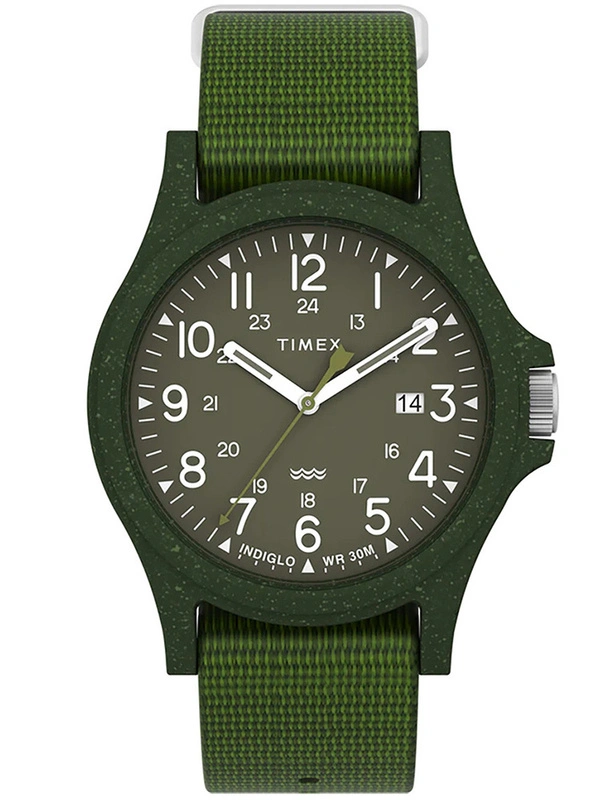 Model z linii Timex Reclaim Ocean wyróżnia się surową, przyrodniczą estetyką. Koperta w odcieniu oliwkowej zieleni została wykonana z materiałów z recyklingu, co nadaje jej lekko matowe wykończenie i podkreśla ekologiczny charakter zegarka. Utrzymany w zbliżonej tonacji, wytrzymały pasek tekstylny dodaje całości outdoorowego stylu. Na ciemnej tarczy umieszczono duże, czytelne cyfry, dzięki którym wskazania czasu są dobrze widoczne niezależnie od otoczenia. To idealny wybór dla osób preferujących minimalistyczne wzornictwo połączone ze świadomym podejściem do środowiska. Zegarek posiada kopertę wykonaną z materiału tide ocean, czyli tworzywa powstałego z przetworzonego plastiku morskiego, co zmniejsza jego wpływ na środowisko. Uzupełnia go miękki, tkaninowy pasek z recyklingu, gwarantujący wygodne dopasowanie. Model wyposażono w podświetlenie INDIGLO, szkiełko mineralne oraz datownik na godzinie 3, dzięki czemu jest praktyczny na co dzień. Wodoodporność 30M chroni go przed zachlapaniem, a czytelna tarcza z arabskimi cyframi pozwala szybko odczytać godzinę. Całość napędza precyzyjny mechanizm kwarcowy.