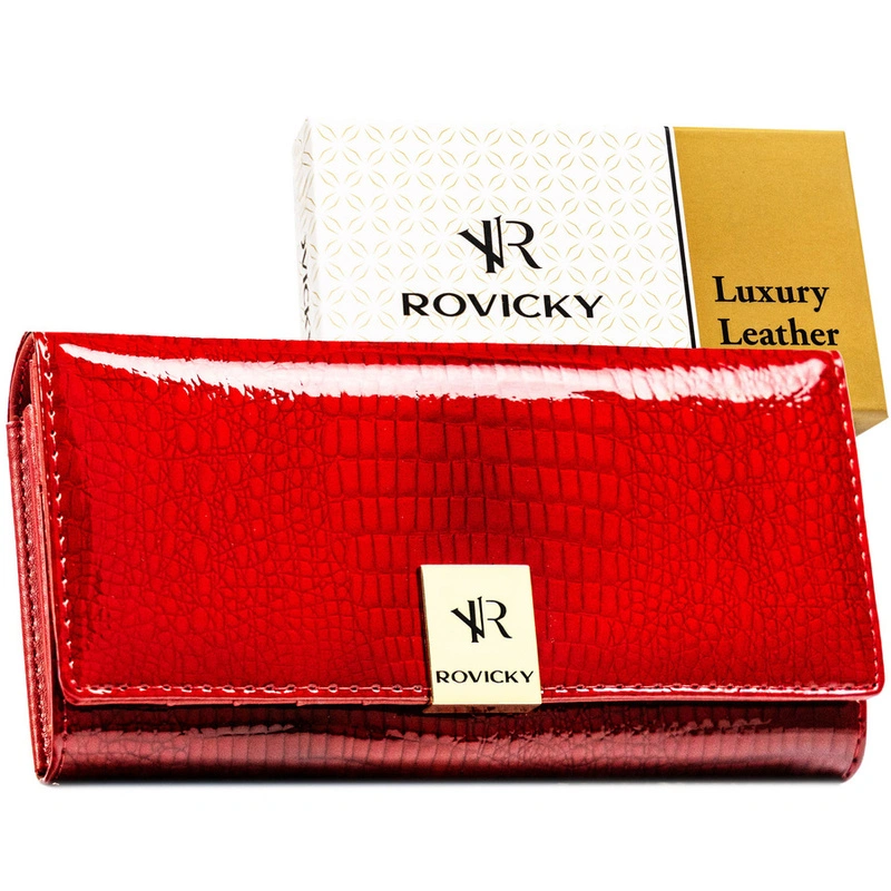 - Pojemny portfel damski wykonany z lakierowanej skóry naturalnej w czerwonym kolorze. Pokryty wzorem imitującym krokodylą skórę. Zamykany na zatrzask. Wyposażony w system RFID i 17 przegródek na karty.