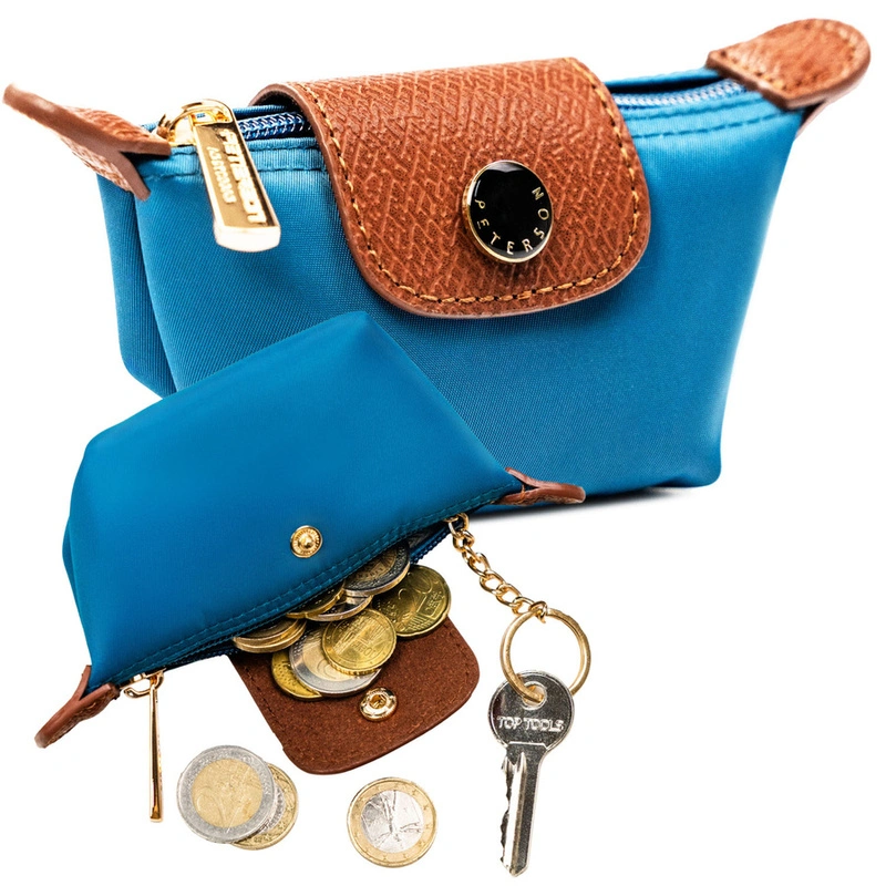 - Kompaktowe, turkusowe etui na klucze wykonane z poliestru i skóry ekologicznej. Posiada 2-stopniowe zabezpieczenie - zamek i klapkę z zatrzaskiem. Wyposażone w mocne kółeczko na klucze.
