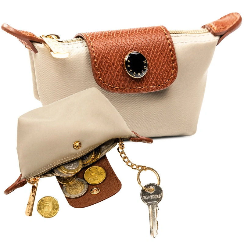 Etui na klucze z poliestru i skóry ekologicznej w jasnobeżowym kolorze, zamykane na zatrzask i suwak - Peterson