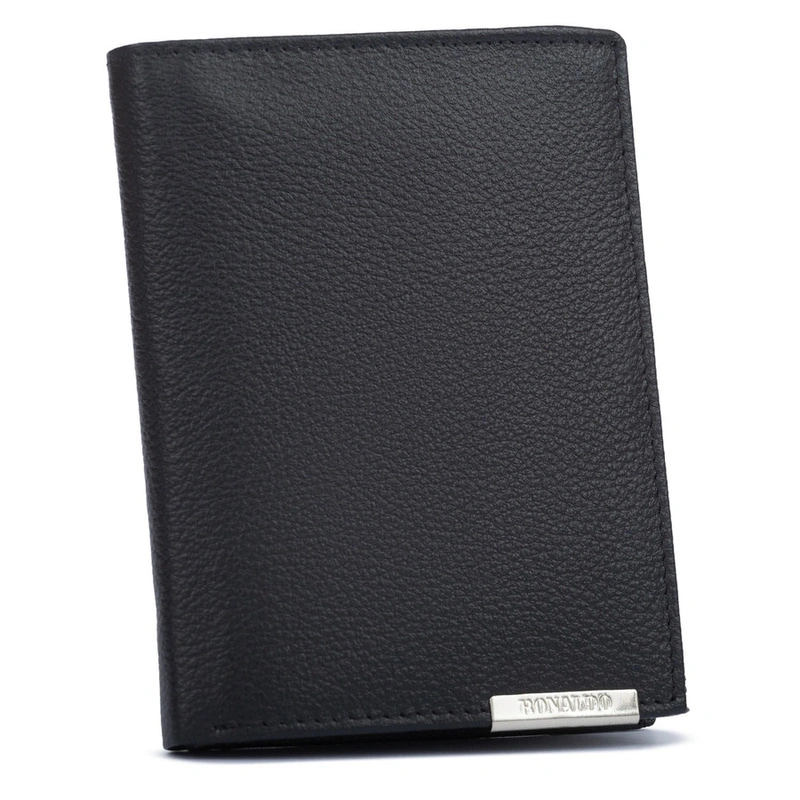 - Portfel męski wykonany ze skóry naturalnej w czarnym kolorze. Model w orientacji pionowej bez zapięcia. Wyposażony w system RFID. Portfel mieści dowód rejestracyjny.