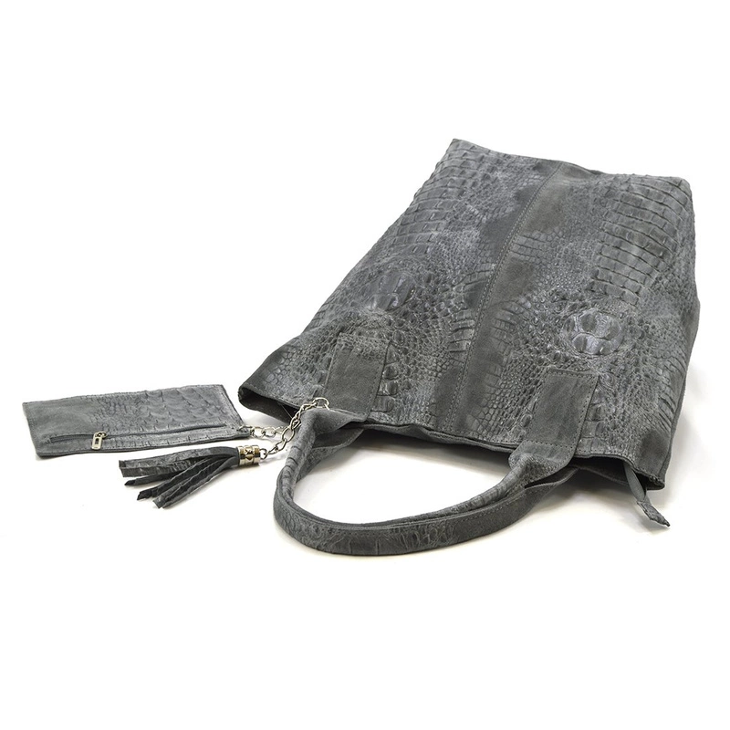 - Niezwykła torebka w fasonie shopperbag lub worka, połączenie skóry naturalnej, tłoczonej na wzór aligatora z zamszem naturalnym. Obszerny model, który bez problemu pomieści format a4.