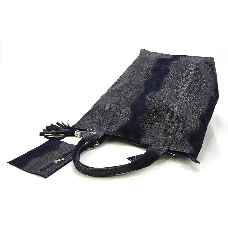 - Niezwykła torebka w fasonie shopperbag lub worka, połączenie skóry naturalnej, tłoczonej na wzór aligatora z zamszem naturalnym. Obszerny model, który bez problemu pomieści format a4.