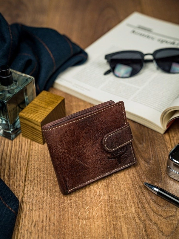 Poręczny portfel męski, składany, zapinany. Wykonany z trwałej skóry naturalnej dobrej jakości. Kompaktowy kształt mieszczący się idealnie w kieszeni. Portfel zapakowany w firmowe, sztywne pudełeczko kartonowe. Model posiada wszytą membranę RFID Stop, która chroni dane z kart przed skimmingiem (kradzieżą danych).
