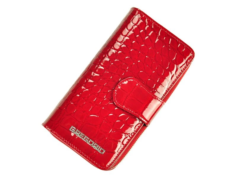 Efektowny, przykuwający uwagę, damski portfel w fasonie piórnika, od marki Gregorio. Staranne wykonanie z najlepszej jakości skóry naturalnej, lakierowanej z niezwykle stylową fakturą, ze wzorem typu skóra krokodyla. Model zamykany na zatrzask oraz na suwak.