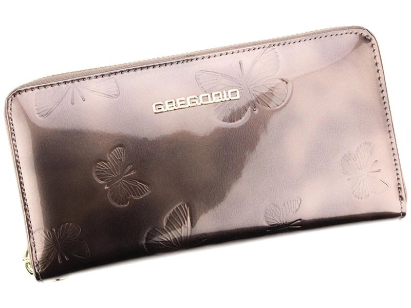 • Efektowny, damski portfel w fasonie piórnika, wykonany z naturalnej skóry lakierowanej, tłoczonej we wzór motyli, z serii Gregorio ButterFly Series. Bardzo duży model, który pomieści wszystkie kobiece skarby. Połączenie elegancji z nowoczesnością.