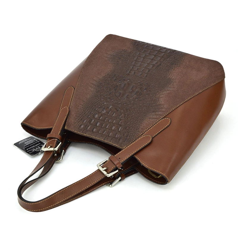 Włoska torebka damska - KUFEREK o oryginalnym plecionym tłoczeniu nawiązuje do modnych torebek koszyków. Dzięki wykonaniu z naturalnej skóry, będzie odpowiednią torebką na cały rok, nie tylko w okresie letnim. Dostęp do wnętrza torby zamykany na zapięcie magnetyczne. W środku znajdziesz dwie komory dzielone zamkniętą przegrodą. Dodatkowo w środku torby znajdują się kieszonki: otwarta i zamykana na suwak. Komfort noszenia dopalania regulacja rączek oraz możliwość dopięcia długiego paska. Solidne skórzane rączki dają gwarancję, że torba wytrzyma nawet większe ciężary. Torebka koszyk damski pasuje zarówno do oficjalnych, jak i do luźnych stylizacji. Modne wzornictwo i funkcjonalność sprawi, że chętnie będziesz po nią sięgać. Jeden z naszych bestsellerowych modeli w kategorii średnia torebka damska.