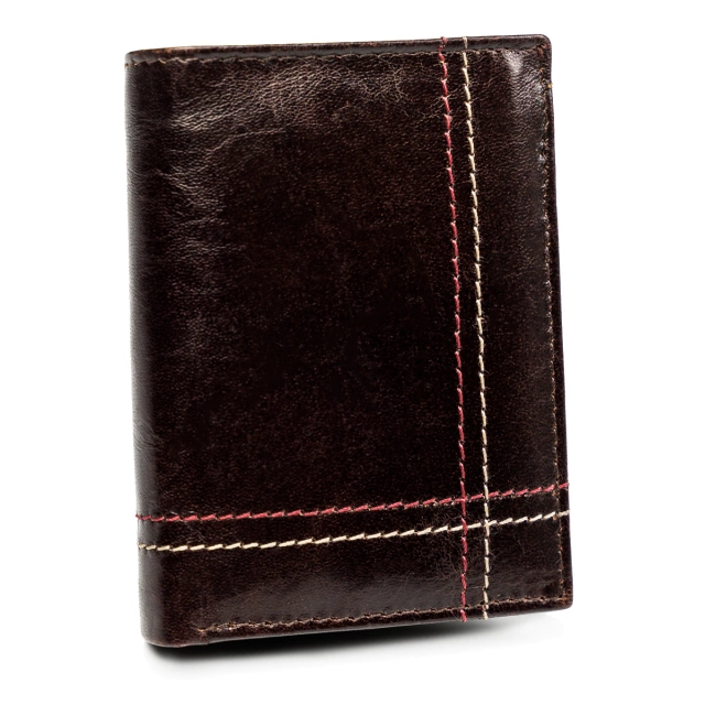 • Średniej wielkości, pionowy portfel męski z dobrej jakości cielęcej skóry naturalnej. Składany, bez zapięcia. Wewnątrz 7 kieszonek na karty kredytowe, przezroczyste okienko na fotografie oraz kieszonka na monety zamykana mocnym zatrzaskiem.