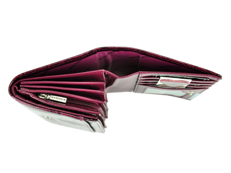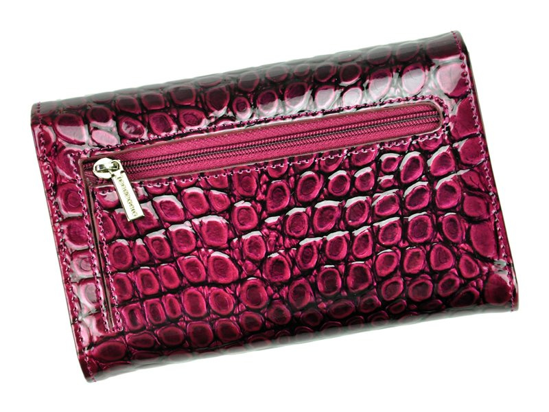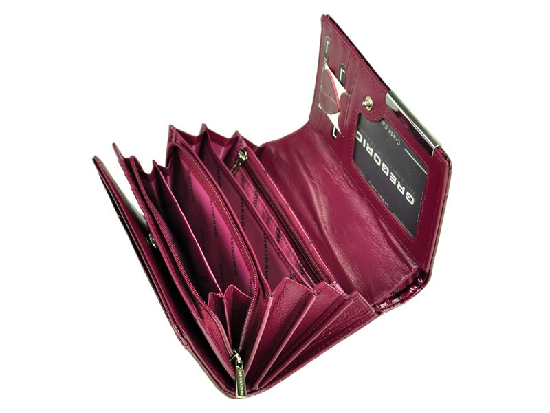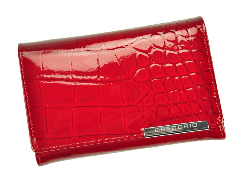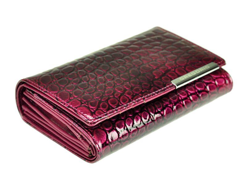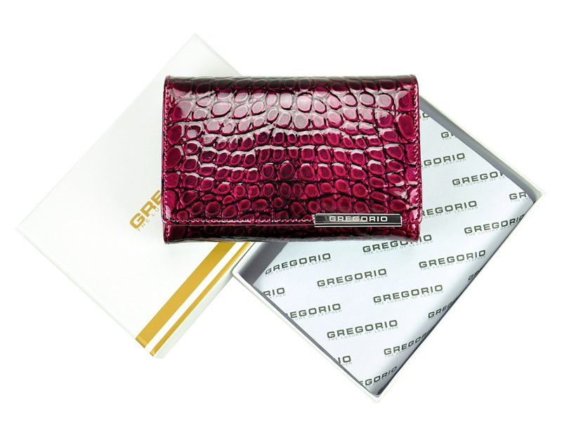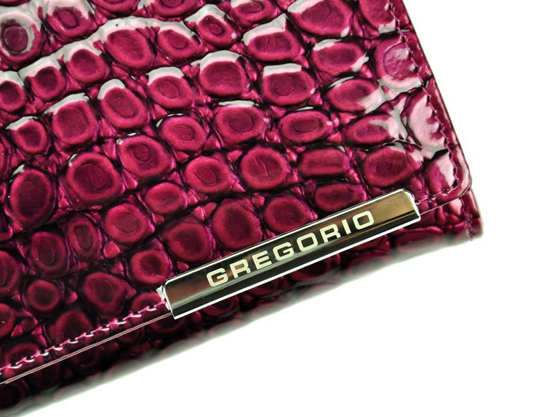 Niezwykle modny, damski portfel o fasonie portmonetki, wyprodukowany przez cenioną markę Gregorio. Staranne wykonanie z dbałością o każdy, nawet najmniejszy szczegół, ze skóry naturalnej, lakierowanej z efektowną fakturą i wzorem typu skóra węża, krokodyla. Dodatkowo na klapie, która zamyka portfel na zatrzask, widoczne jest ozdobne logo producenta, wykute na srebrnej blaszce.