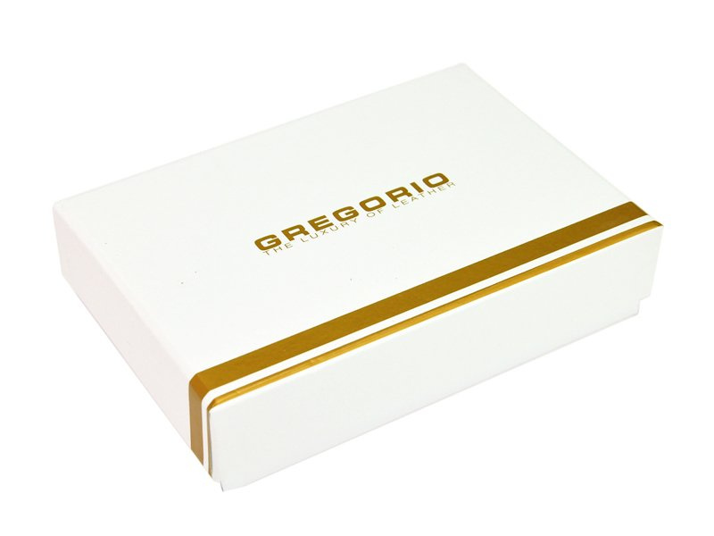 • Gustowna portmonetka w świetnym stylu z lakierowaną fakturą i wzorem typu skóra węża, krokodyla. Portfel zamykany na zatrzask. Dodatkowo na srebrnej blaszce, widoczne jest wykute logo producenta Gregorio, które podkreśla elegancki charakter tego modelu.