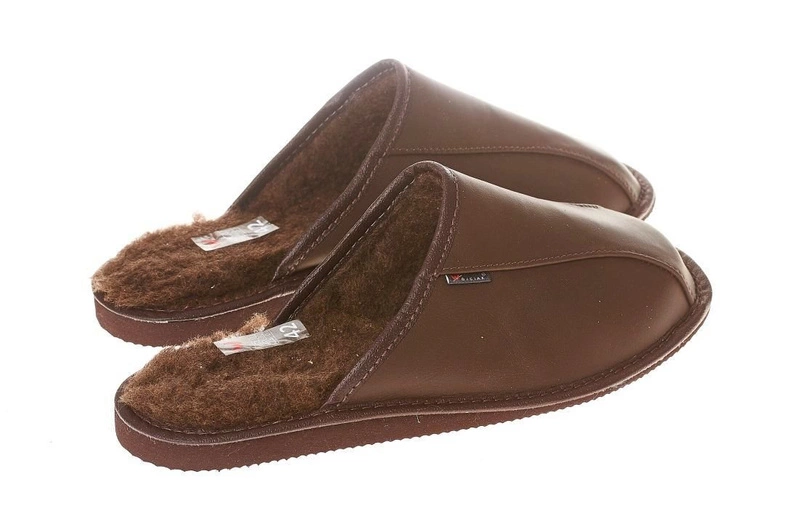 Opinie o Skórzane pantofle męskie klapki domowe z ciepłą wkładką z wełny pw295 brązowy