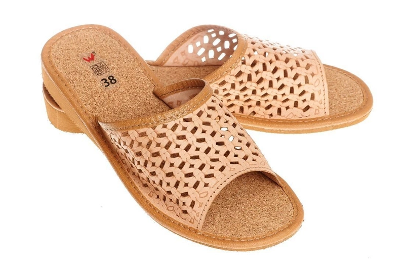 Pantofle wykonane ze skóry naturalnej, z otwartym palcem.