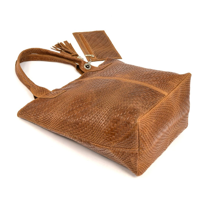 - Zmysłowa i wyjątkowa torebka w fasonie shopperbag lub worka, wykonana ze skóry naturalnej, o przeplatanej fakturze. Model, który z łatwością pomieści format A4. Charakterystyczny wzór doda Tobie elegancji, niezależnie od okazji.