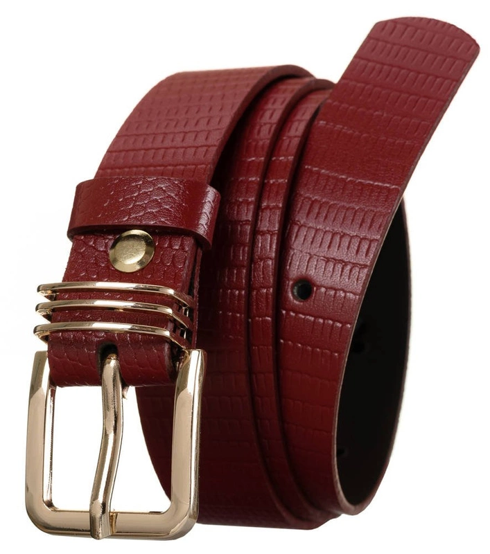 - Nietuzinkowy pasek damski wykonany z wysokiej klasy bydlęcej skóry naturalnej i solidnych metalowych elementów. Posiada złotą metalową klamerkę w prostokątnym kształcie. Na skórze tłoczenia imitujące skórę węża. Możliwość samodzielnego skrócenia paska.