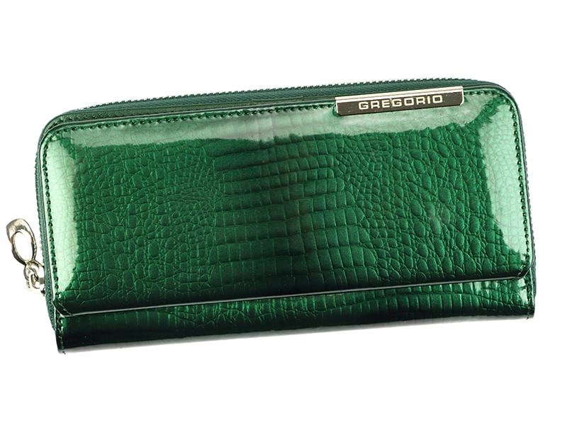 • Wyjątkowo pakowany, duży portfel od marki Gregorio. Świetne wykończenie ze skóry lakierowanej z pięknym motywem skóry węża, krokodyla. Srebrne zdobienia podkreślają wyrazistość i dodają temu modelowi eleganckiego i gustownego charakteru.