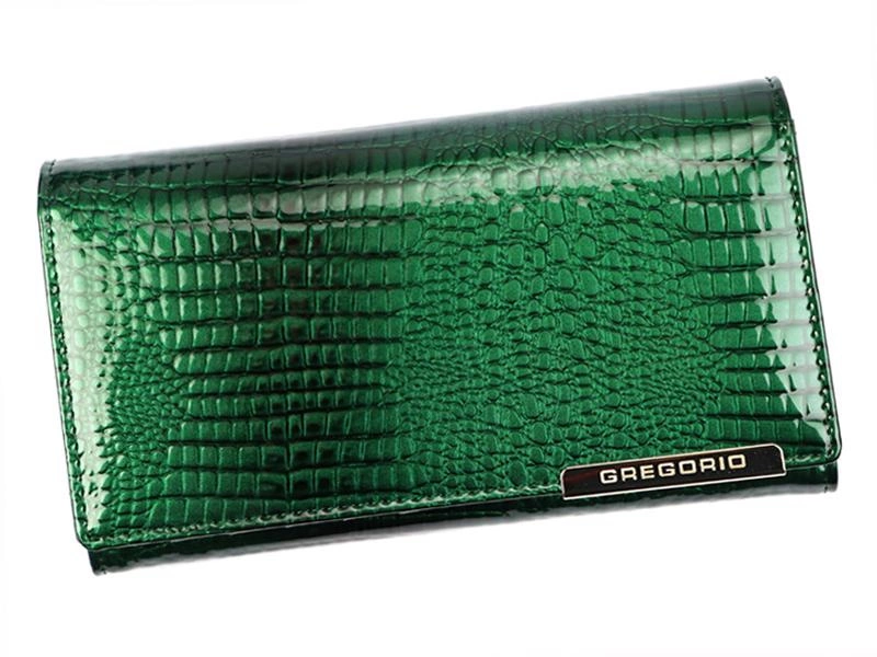 - Duży, modny damski portfel od marki Gregorio. Zamykany na solidny zatrzask. Wykonany ze skóry naturalnej, wraz ze wzorem skóry krokodyla. Wewnątrz, dużo miejsca do przechowywania. Zapakowany w oryginalne pudełko. Zapraszamy.
