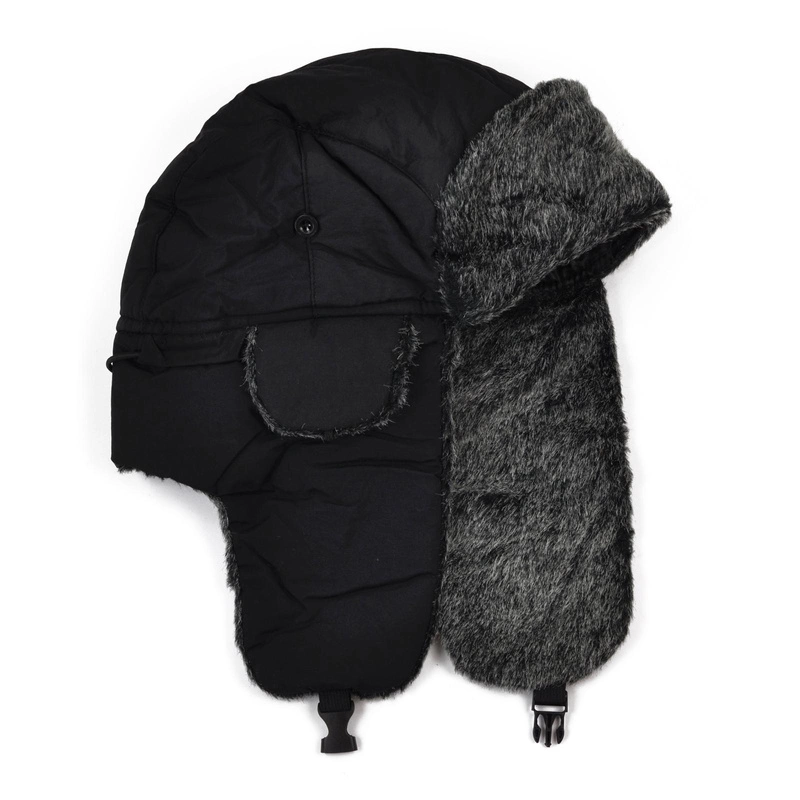 Ma dodatkową klapkę na ucho również podszytą futerkiem, którą można przypiąć do góry lub do dołu.