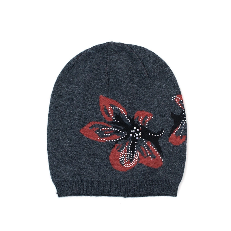 Elegancka czapka typu beanie z motywem rajskiego kwiatu ozdobionego błyskotkami.